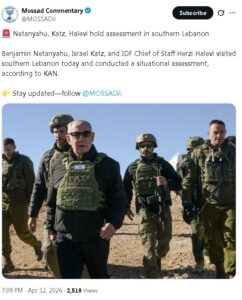 “رئيس الوزراء الإسرائيلي بنيامين نتنياهو ووزير الدفاع الإسرائيلي يسرائيل كاتس ورئيس الأركان الإسرائيلي السابق هرتسي هاليفي زاروا جنوب لبنان اليوم وأجروا تقييماً للوضع”.