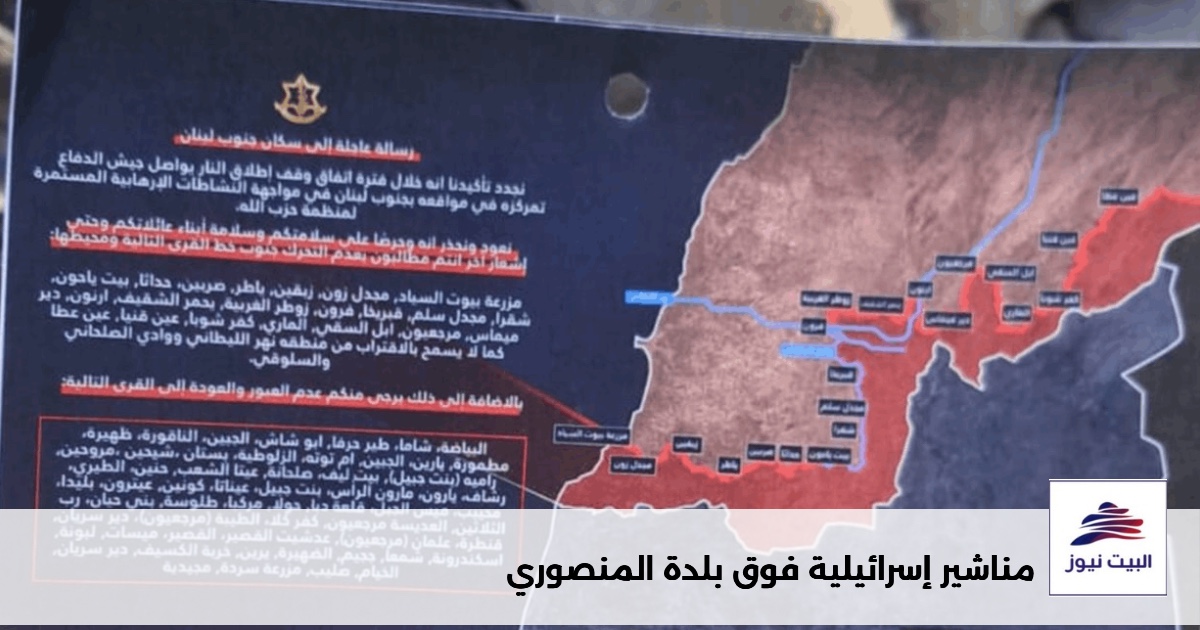 ألقت طائرة إسرائيلية عدداً كبيراً من المناشير فوق بلدة المنصوري في جنوب لبنان، وتضمّنت خريطة نشرها الجيش الإسرائيلي مؤخراً، تحذيراً من الاقتراب من المناطق الواقعة ضمن ما يُعرف بـ«الخط الأصفر» في جنوب لبنان.