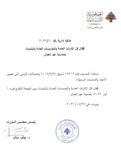 Categories متفرقات مذكرة بإقفال كافة الإدارات والمؤسسات العامة أبريل 27, 2026 Estimated read time 0 min read أصدر رئيس مجلس الوزراء نواف سلام، مذكرة بإقفال كافة الإدارات العامة والمؤسسات العامة والبلديات، يوم الجمعة 1 أيار، بمناسبة عيد العمال. شارك هذا الموضوع: شارك على فيس بوك (فتح في نافذة جديدة) فيس بوك المشاركة على X (فتح في نافذة جديدة) X المشاركة على Telegram (فتح في نافذة جديدة) Telegram المشاركة على WhatsApp (فتح في نافذة جديدة) WhatsApp اطبع (فتح في نافذة جديدة) طباعة إرسال رابط بالبريد الإلكتروني إلى صديق (فتح في نافذة جديدة) البريد الإلكتروني