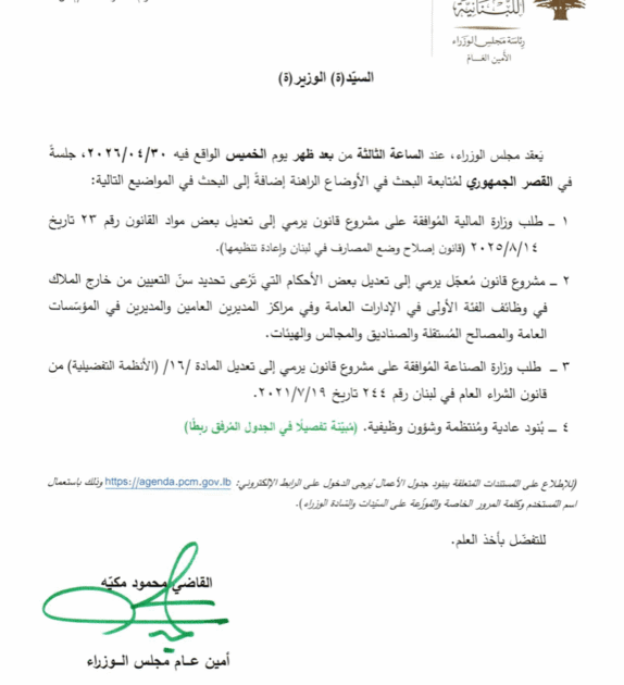 Categories متفرقات جلسة لمجلس الوزراء الخميس.. وهذا جدول الأعمال أبريل 28, 2026 Estimated read time 0 min read يعقد مجلس الوزراء جلسة نهار الخميس المقبل في القصر الجمهوري، الساعة الثالثة بعد الظهر.تجدون أدناه جدول الأعمال المتوقع مناقشته. شارك هذا الموضوع: شارك على فيس بوك (فتح في نافذة جديدة) فيس بوك المشاركة على X (فتح في نافذة جديدة) X المشاركة على Telegram (فتح في نافذة جديدة) Telegram المشاركة على WhatsApp (فتح في نافذة جديدة) WhatsApp اطبع (فتح في نافذة جديدة) طباعة إرسال رابط بالبريد الإلكتروني إلى صديق (فتح في نافذة جديدة) البريد الإلكتروني